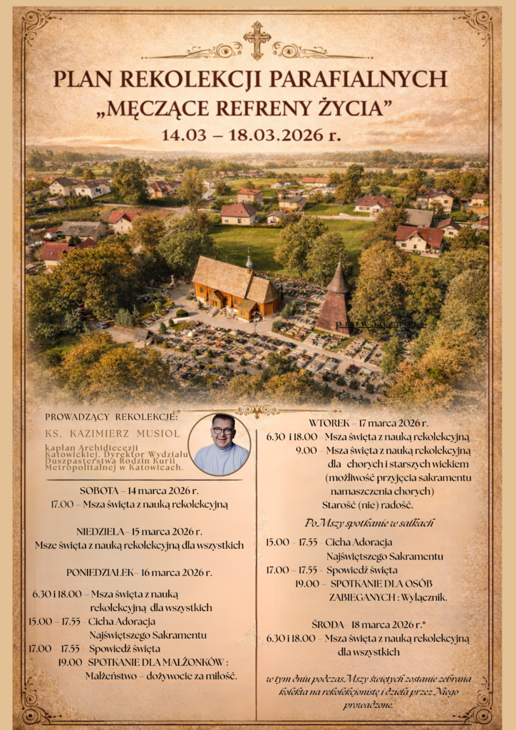 Rekolekcje szkolne odbędą się w dniach 18-20.03.2026 r., w naszym kościele parafialnym. Uczniowie podzieleni zostali na dwie grupy: starsza kl. V – VIII spotykają się w kościele o godz. 8.15. Po skończonych naukach idą do szkoły na lekcje. Młodsi uczniowie: kl. I- IV, mają swoje spotkanie rekolekcyjne o godz. 9.45. Rekolekcje dla uczniów poprowadzi ks. Tomasz Antczak.